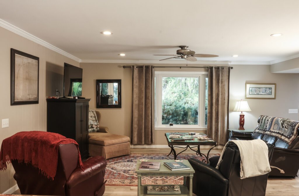 Inside, you’ll find comfortable furnishings, clean lines, and thoughtfully arranged rooms that work just as well for relaxing mornings as they do for quiet evenings in. Whether you’re sharing meals, catching up on work, or winding down after a day exploring Beaufort, the space supports your stay without feeling overdone.